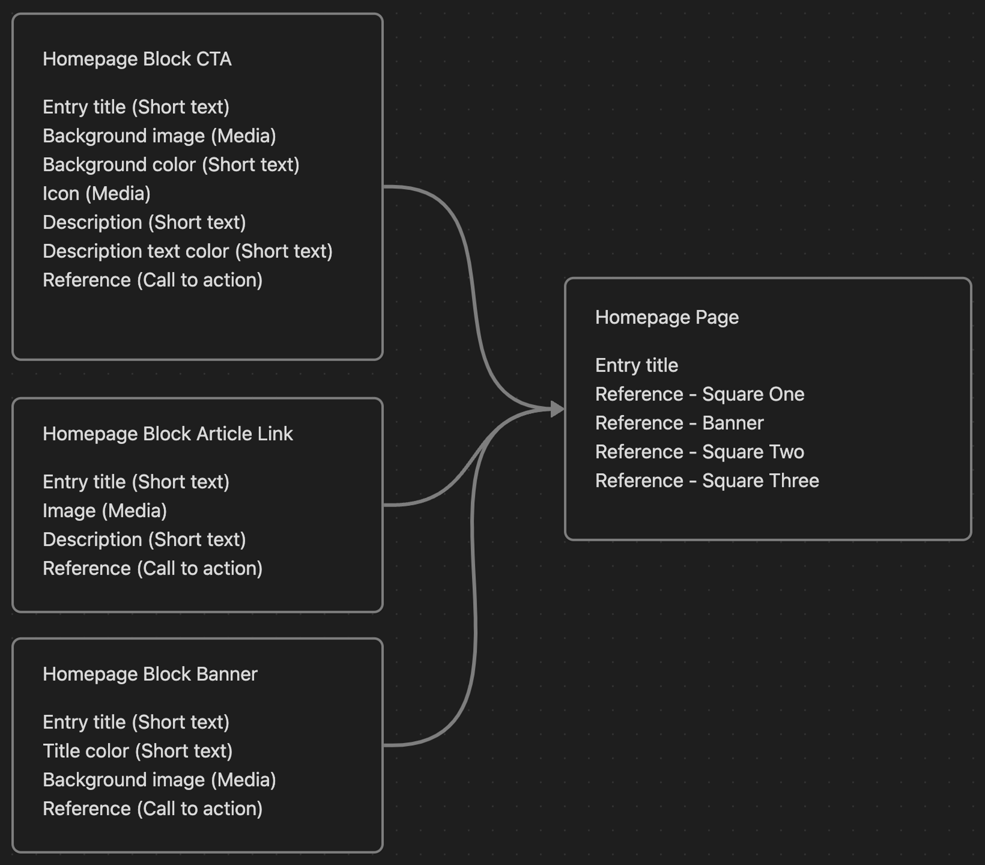 The homepage is composed of various sections, some of which rely on data coming directly from the CMS. Because these sections are positioned differently within the layout of the page, using a single content model approach was impractical. To overcome this hurdle we developed a “Page'' content model with distinct fields allocated to specific positions on the page.