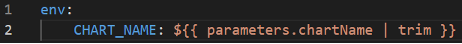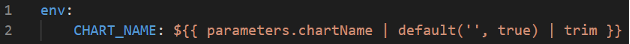 This seemed to work, until we noticed that the CHART_NAME environment variable did not always contain the expected value. In some cases, it was set to the literal value ${{ parameters.chartName | trim }}.