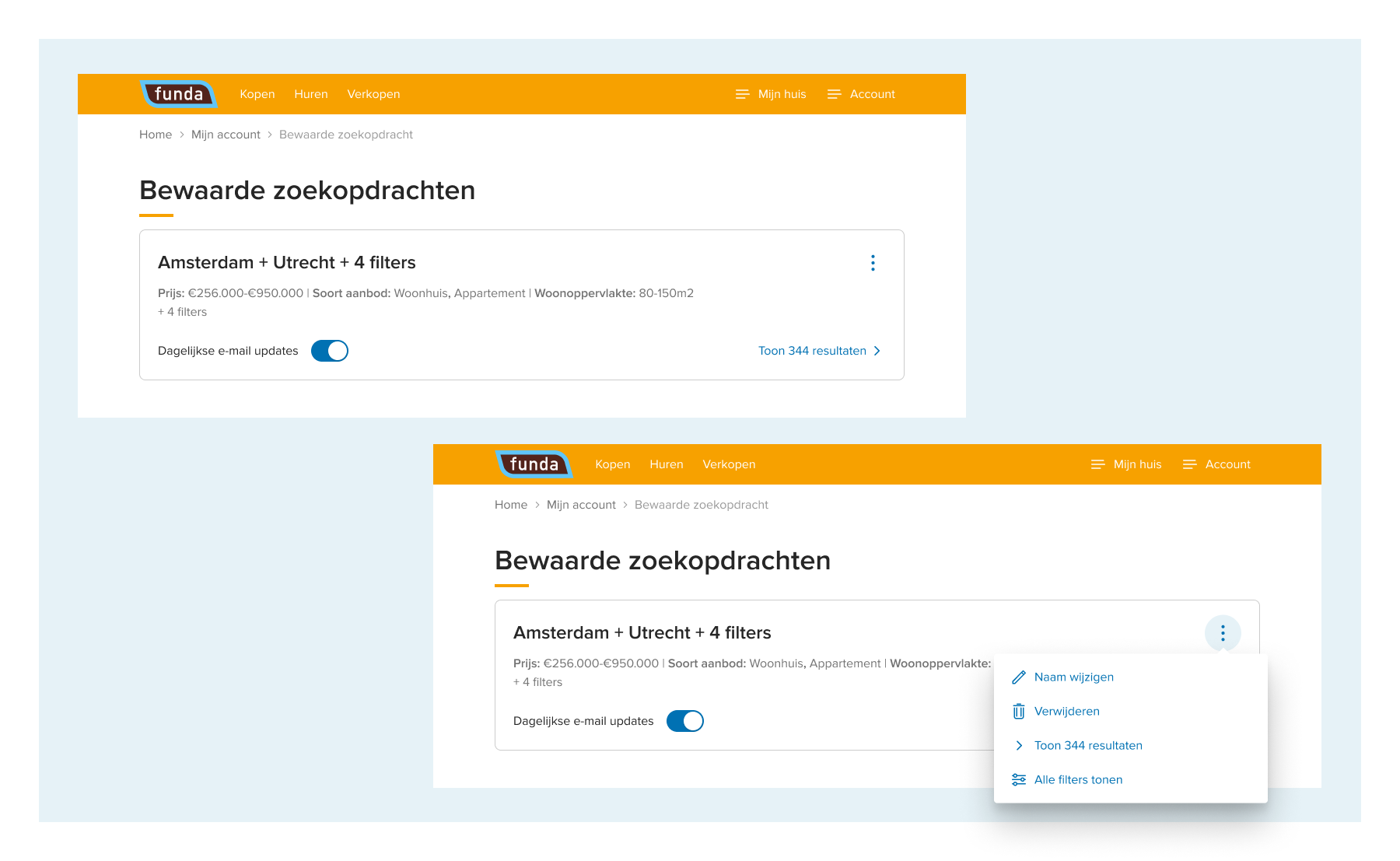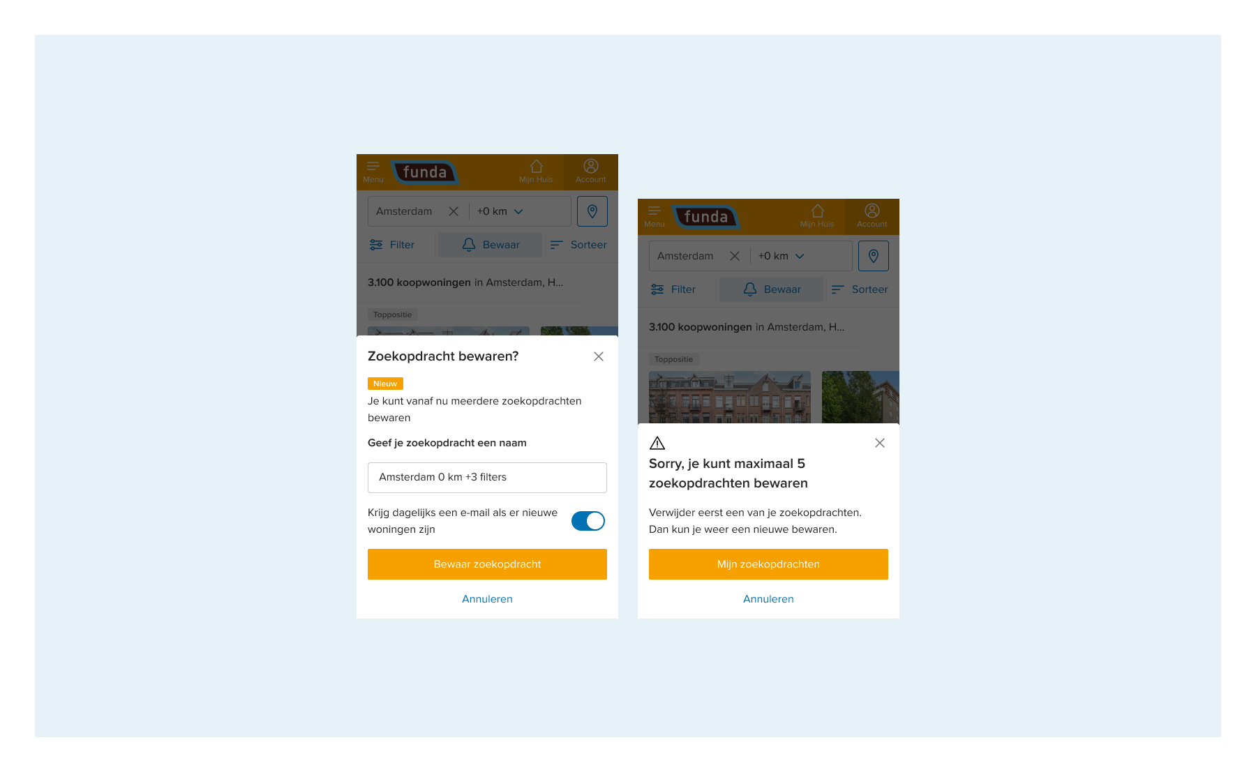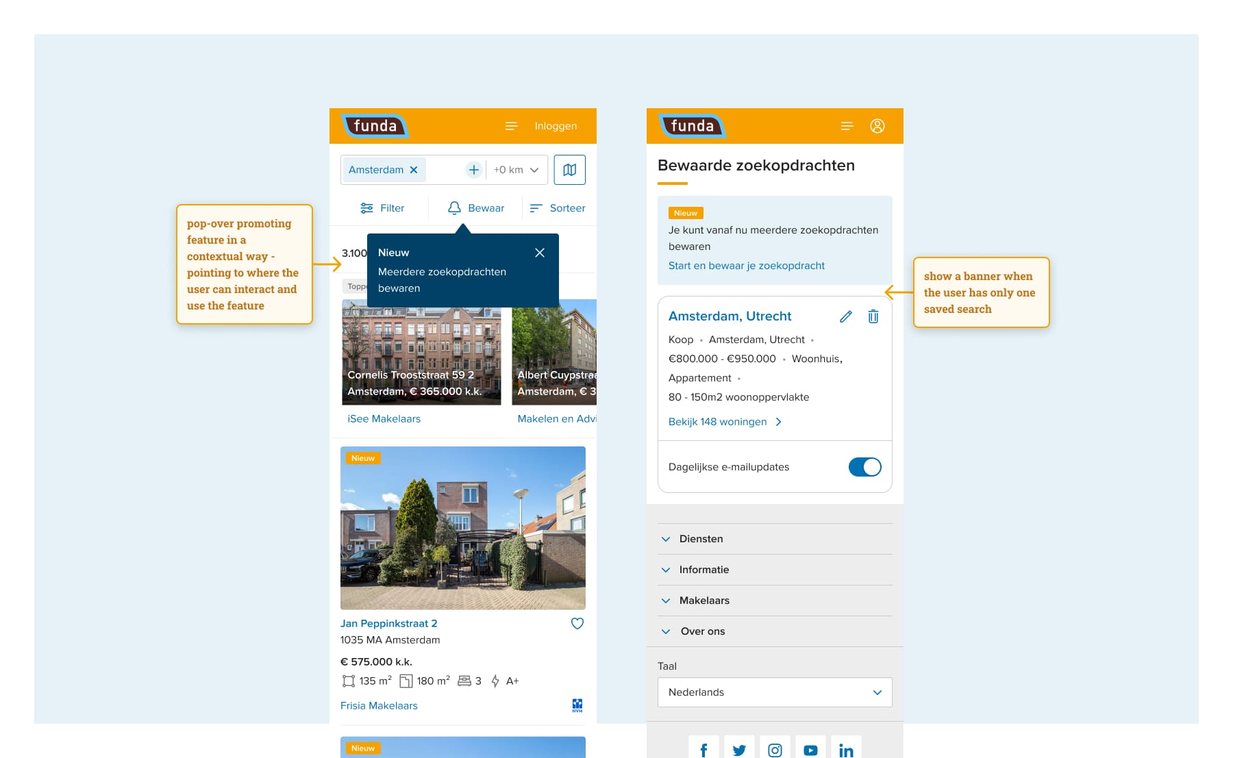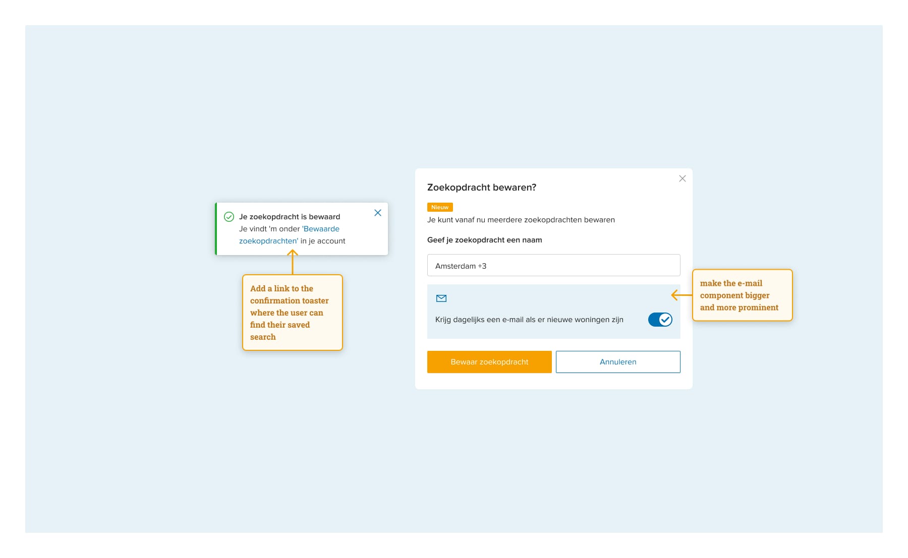 - Users struggled to find their saved searches on funda.nl. Various optimization methods exist, such as adding a main navigation entry, but this could heavily impact other areas. Instead, we chose a simple solution: adding a link in the confirmation toaster for easy access to saved searches.