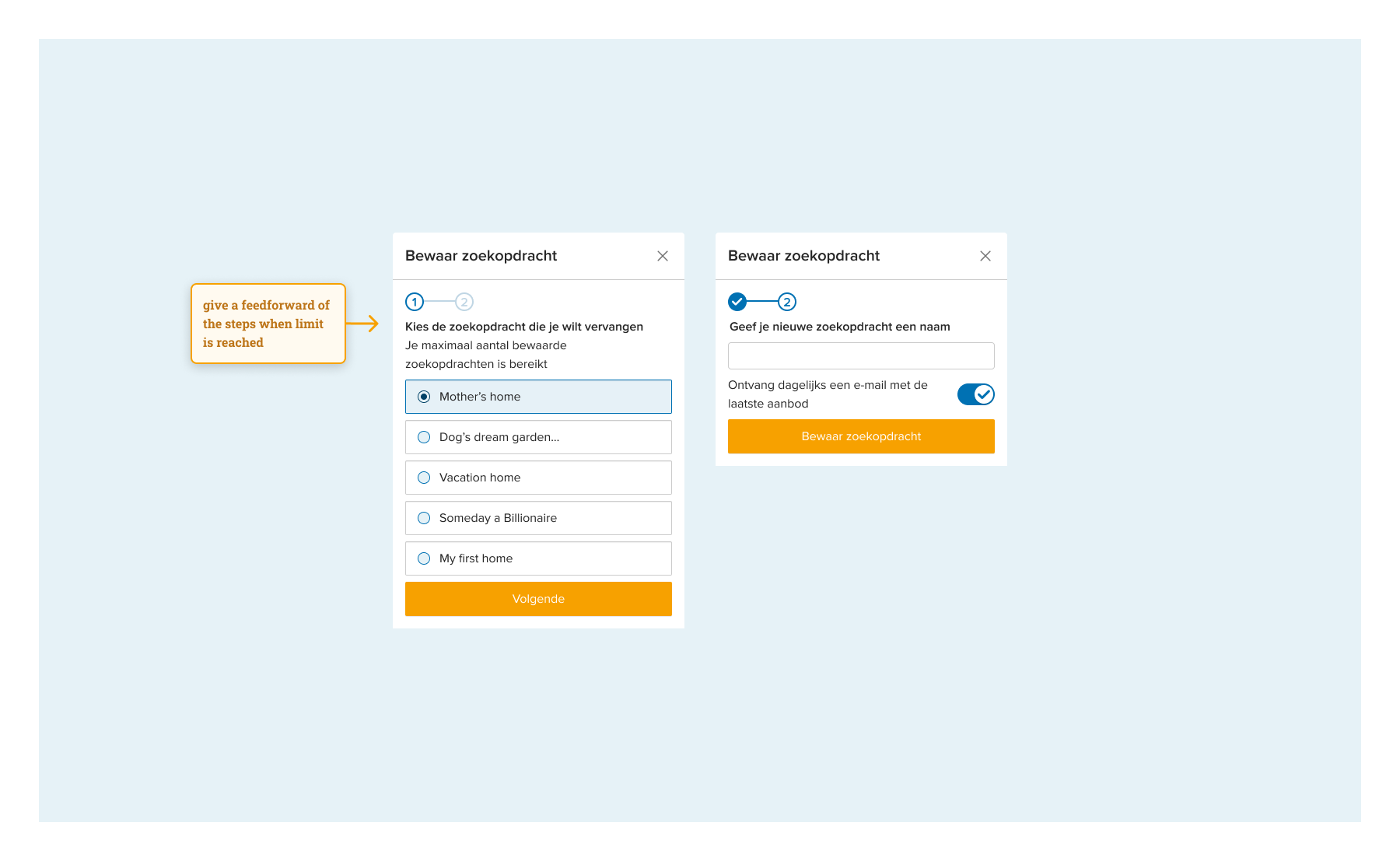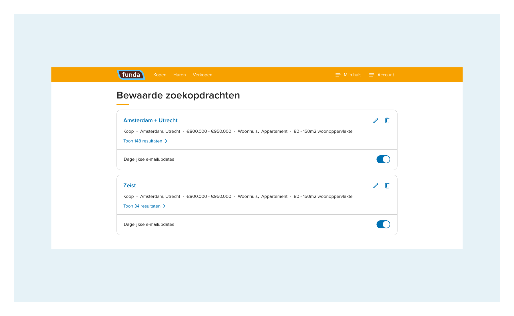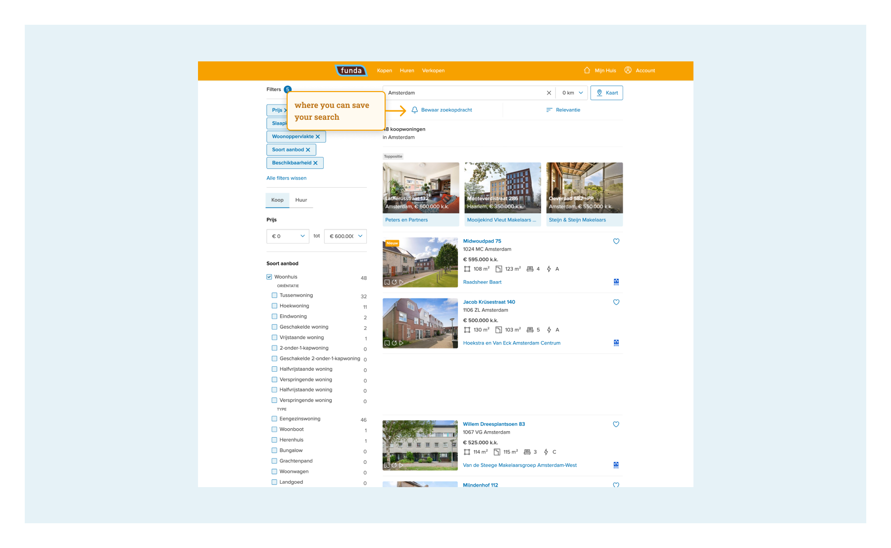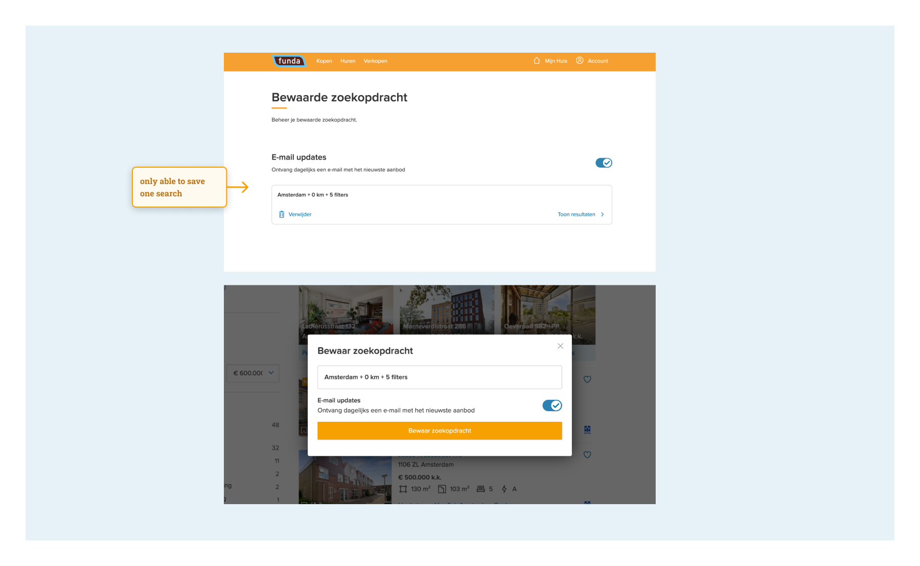 - Users struggled to find their saved searches on funda.nl. Various optimization methods exist, such as adding a main navigation entry, but this could heavily impact other areas. Instead, we chose a simple solution: adding a link in the confirmation toaster for easy access to saved searches.