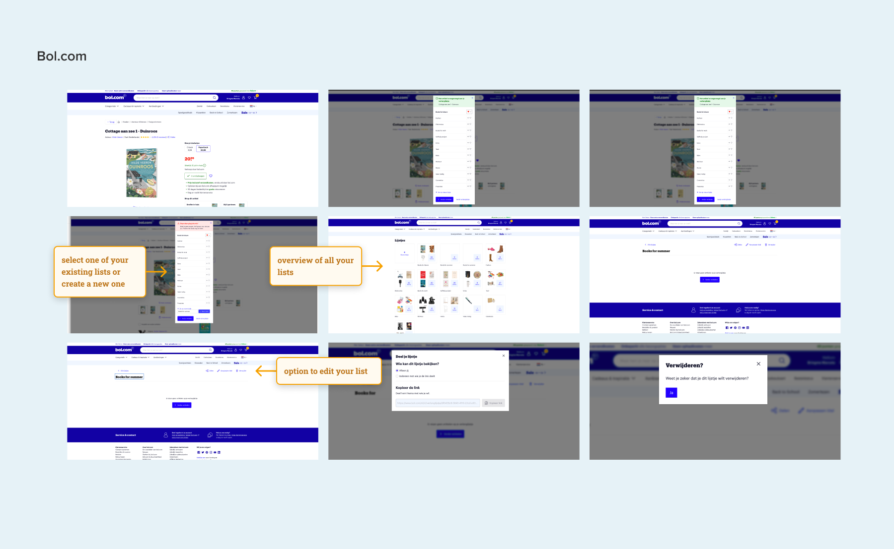 Inspired by e-commerce websites like Bol.com, where you can easily save an item in one of your previously created wish lists, I started with the idea of replacing a current search or creating a new one. I made different iterations to make that possible: