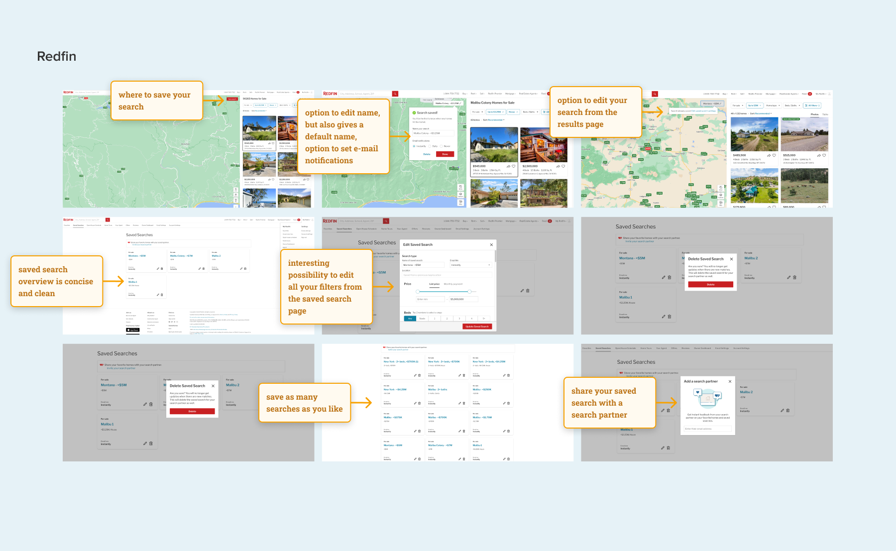 My research focuses on how other companies implement similar features, exploring aspects like user flow, the number of steps to save a search, placement of the save search feature, the format of 'new property available' emails, the number of properties displayed in emails, the limit on saved searches, and additional features like renaming, editing or deleting searches.