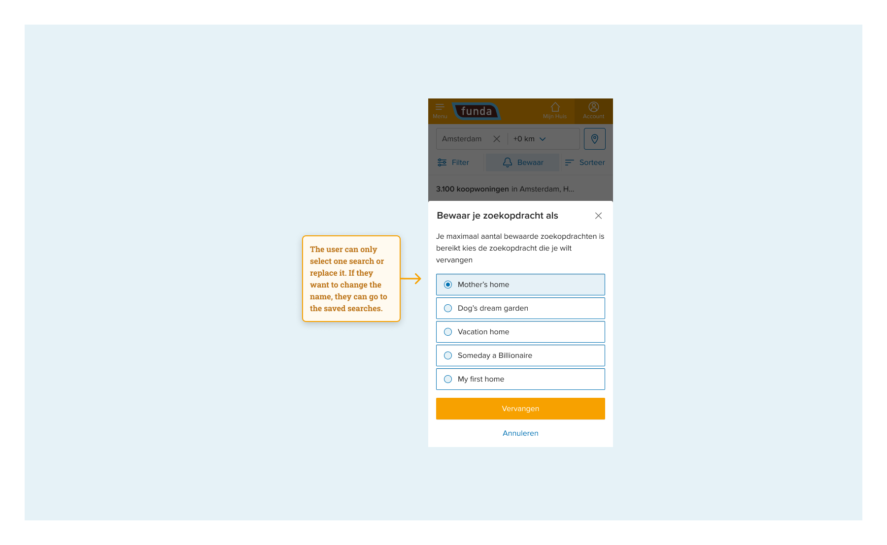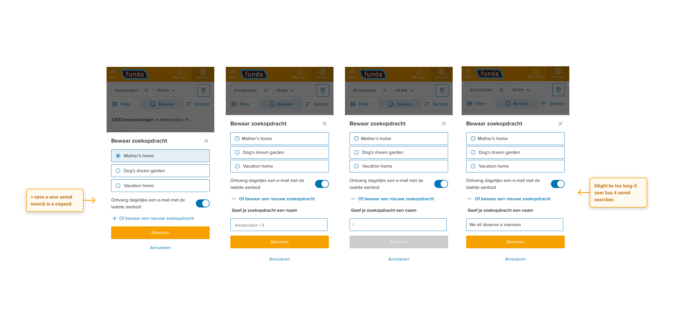 Before launching a new feature or product, we need to know if there is a market for it. Fortunately, at funda we are lucky to have many involved users who love sharing their funda experience with us. That is how we knew from data that a lot of people wanted the possibility to save more than one search. We received regular requests each month to add this feature.