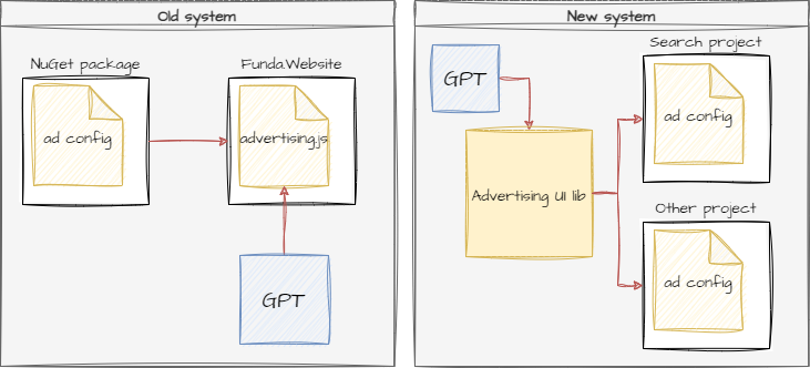 Historically this feature lived in two places. One location, a JavaScript file that was part of the funda website monolith, was responsible for loading the Google Publisher Tags (GPT) library and controlling the advertisements. The other, a NuGet package consumed by the same monolith, dealt with the configuration for each specific advertisement position.