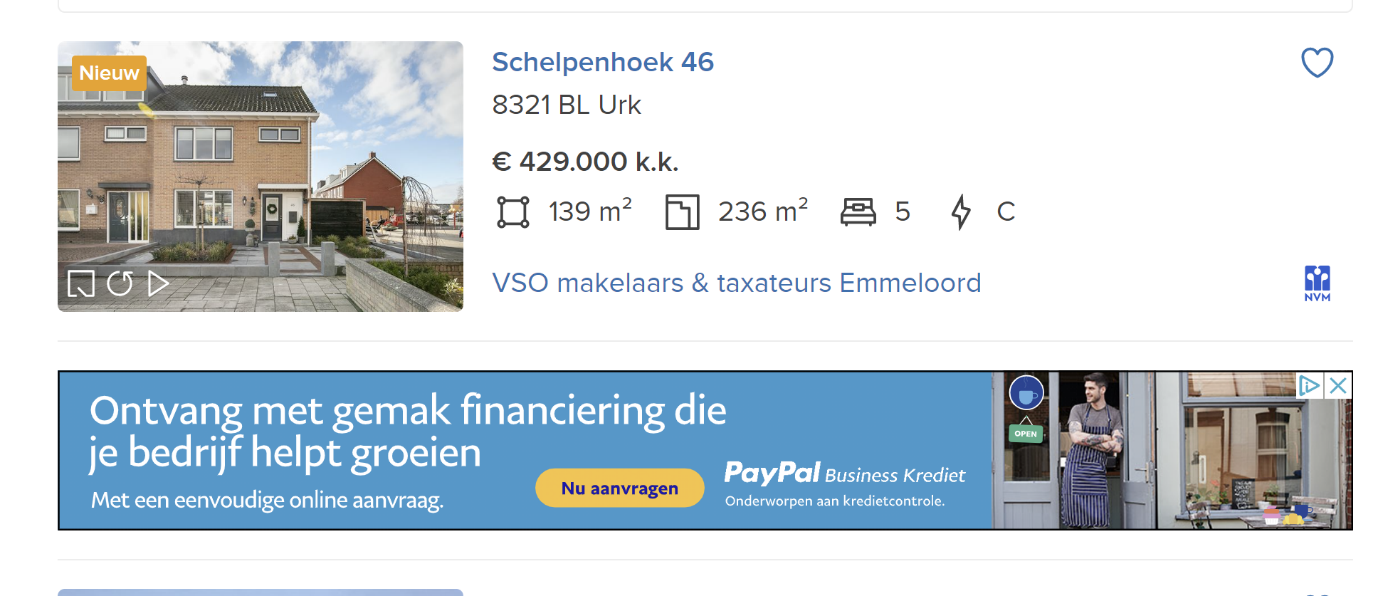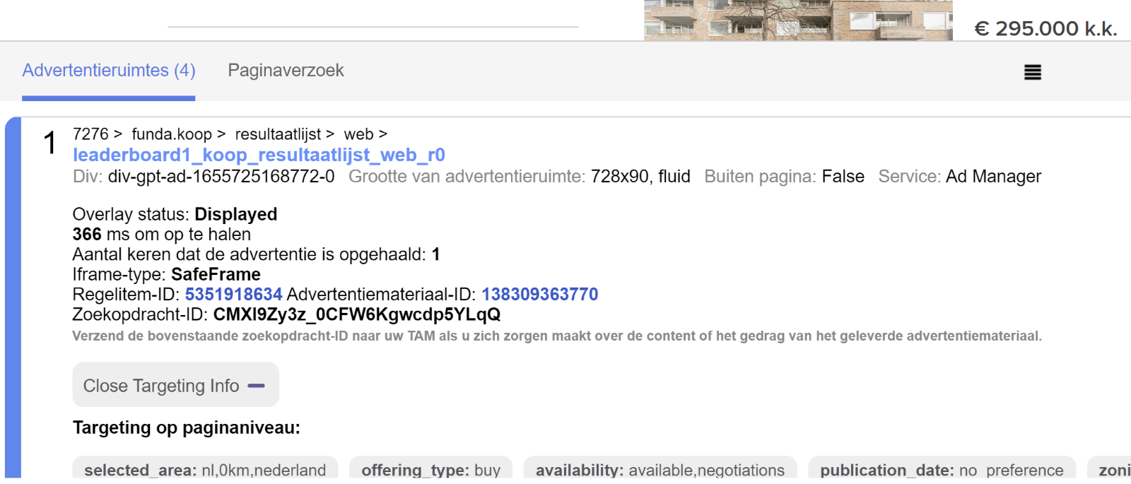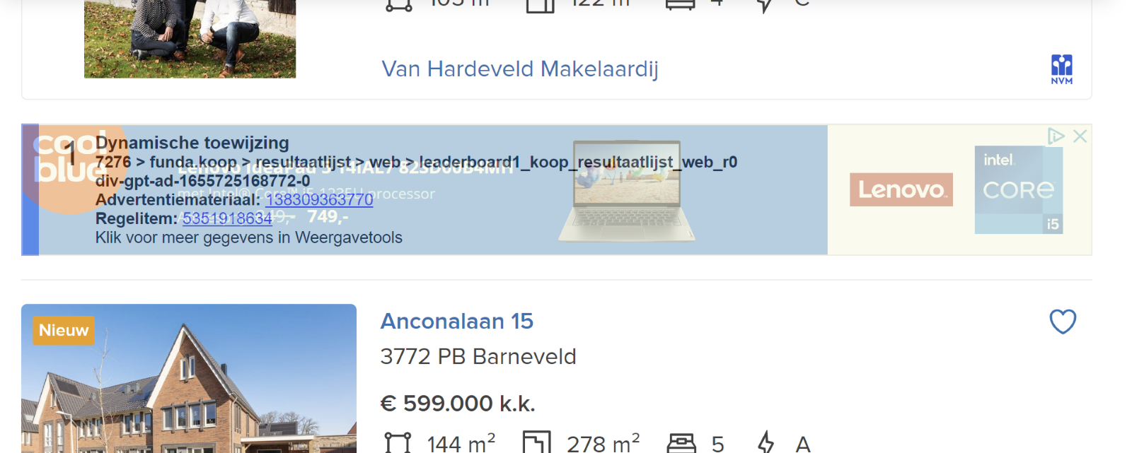 The image below displays an ad placement on the updated funda search interface, known as the 'leaderboard'. Each advertisement visible on the funda website is a distinct placement, defined within the Google Ad Manager platform where all ads are managed. At funda, Yield Managers belonging to the advertising team handle the ad management. Developers can leverage the Google Ad Manager platform to find relevant settings for ad positions defined in their respective projects.