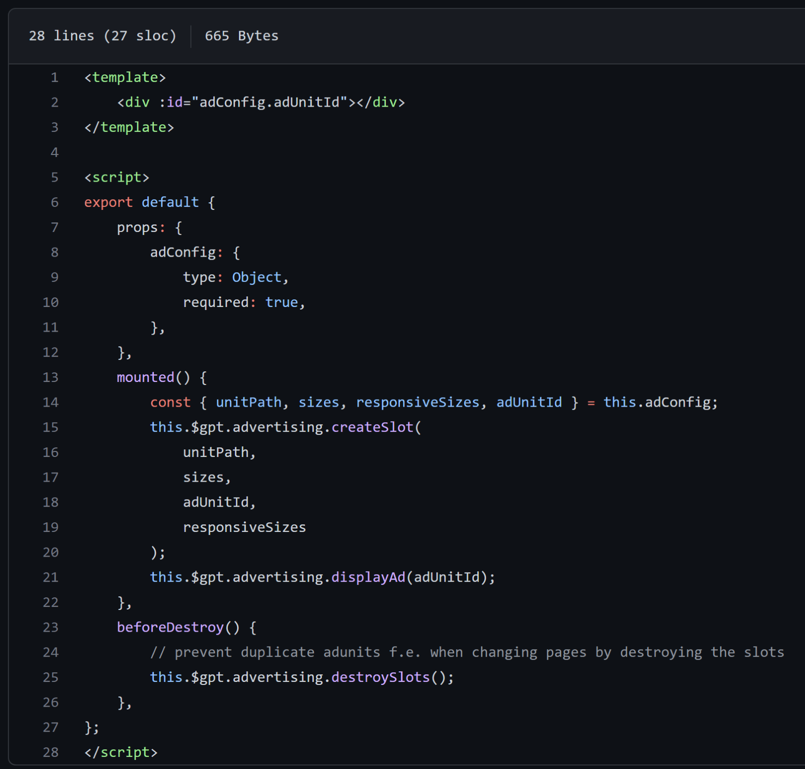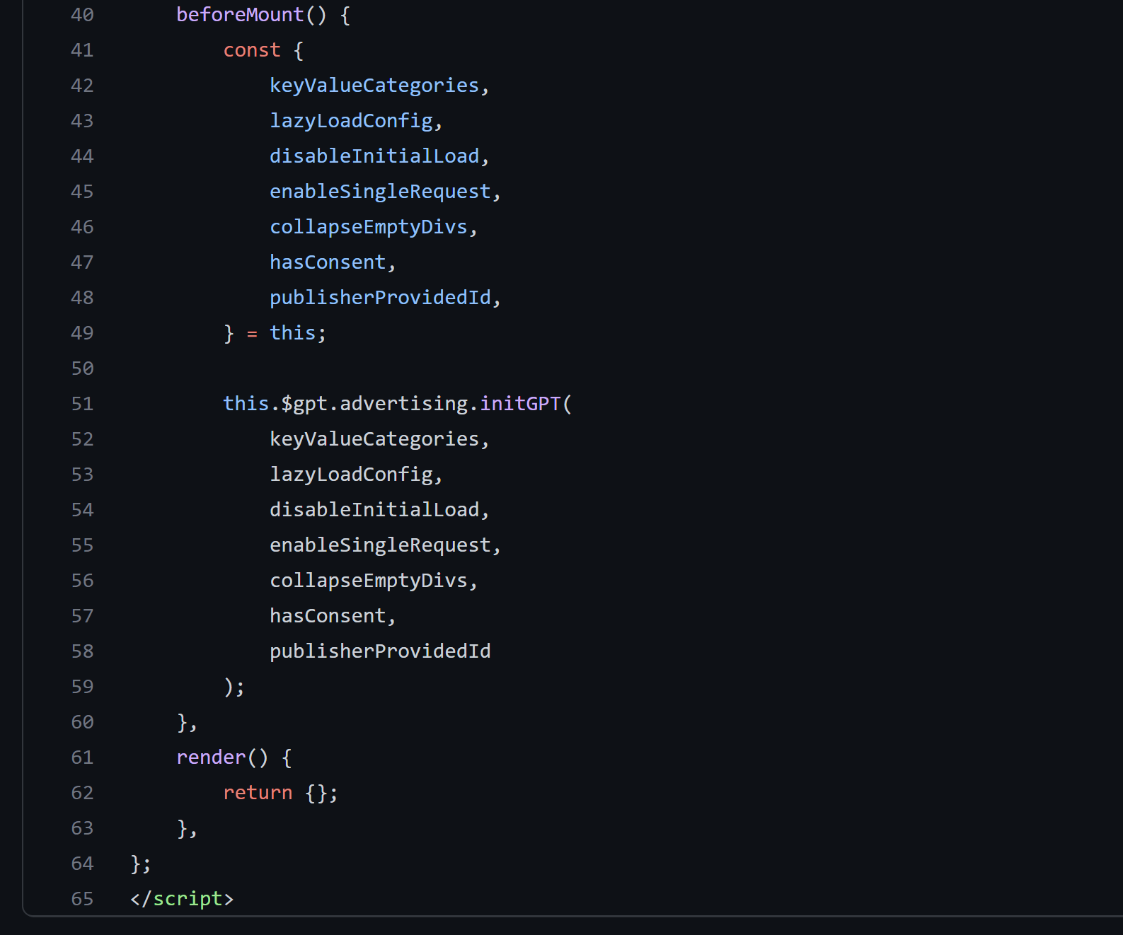 This configuration, which is similar to the ad specific configuration defined on the project level (e.g. search project) to promote team autonomy, is passed down to the “AdvertisementBase” UI component. This component initialises Google Publisher Tags right before the component Is mounted using the initGPT method. This is a method defined in the Advertising UI library that handles all the global configuration parameters it receives. Most of these parameters deal with commands or configurations known to GPT, e.g. enabling and configuring lazy loading.