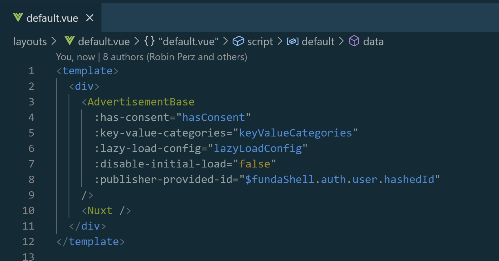 The AdvertisementBase component is usually set in the default layout of a Nuxt application, so that you can load the advertising implementation only once for all pages. In case you do not have advertising positions on all pages, you can move this component into a page component specific to the page you want your advertisements to be displayed.