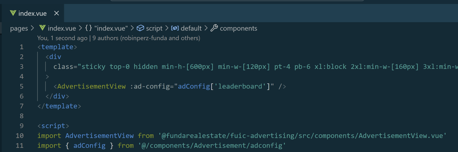 Once you have added your AdvertisementBase component, you should add an AdvertisementView component. The location of this component depends on where you want your ad to be displayed. Once we have imported the component and determined where in the template tag we want to render the component, we can pass down the ad configuration that belongs to the ad position. A reminder: this configuration is defined in your ad configuration. However, if you only have only a single ad, you could also specify the configuration directly in your component’s file.