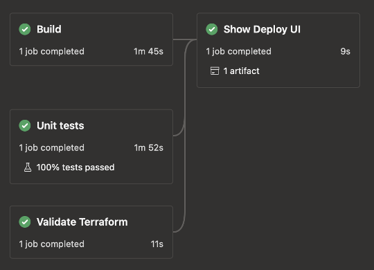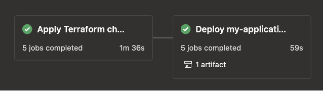 While previously we had separate infrastructure and application deploy pipelines, our new pipelines perform both these tasks. This reduces the cognitive load on our developers, as generally the same commit will have been used for both the code and infrastructure in an environment.