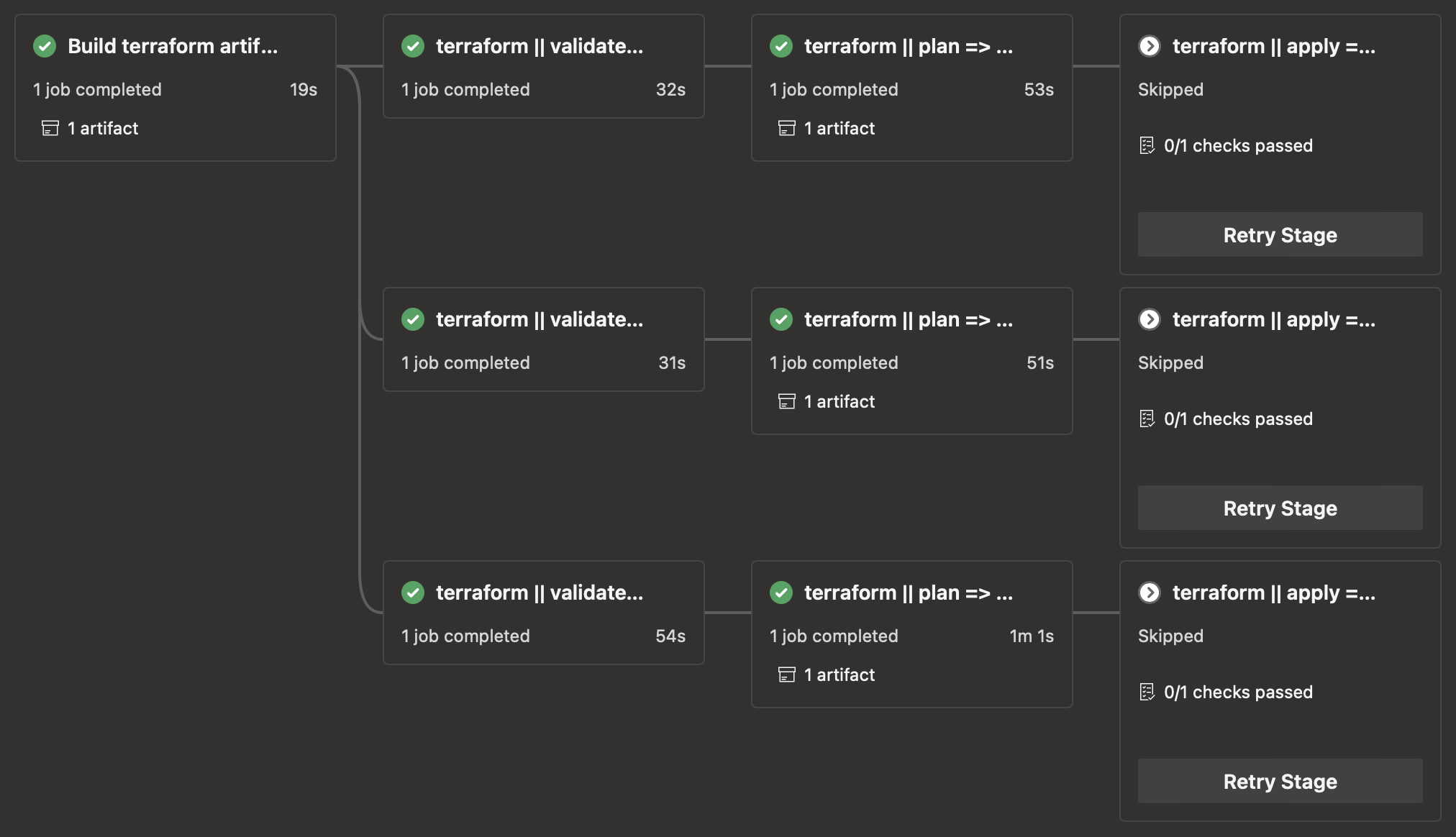 This example contains just two stages, TerraformPlanApply and DeployHelm. The Terraform stage detects whether infrastructure changes have been made, and if so, generates a plan. After getting explicit approval for that plan, it will apply the changes. If no changes have been made, no approval is necessary and most of this stage will be skipped to save time.