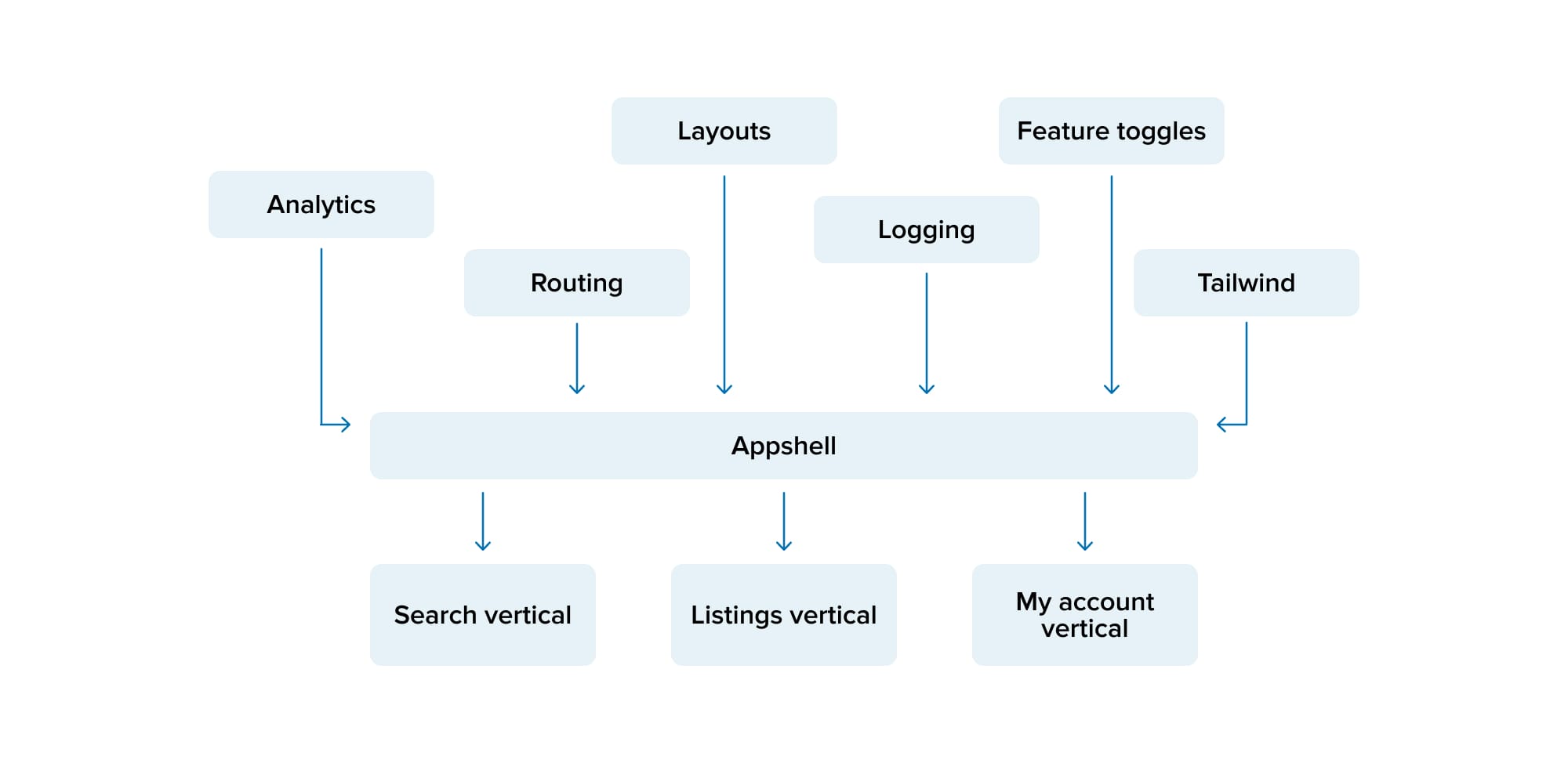 Every vertical runs a standalone Nuxt application. However, there are also parts that are shared among all verticals, such as the layout (including the header and footer) and certain services like error logging, feature toggles, analytics, etc.